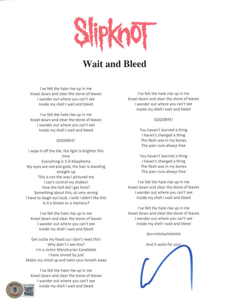 Corey Taylor Slipknot Signed Autograph Wait and Bleed Lyric Sheet 8.5x11 Beckett