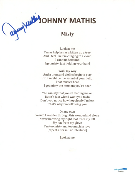 Johnny Mathis Signed "Misty" Song Lyric 8.5x11 Sheet Autograph Singer ACOA COA