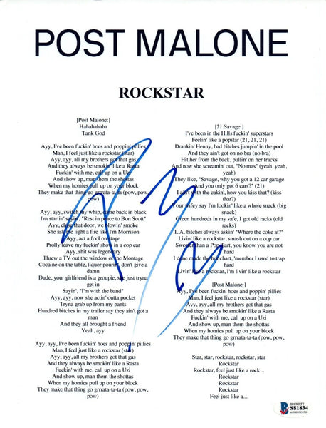 Post Malone Signed "Rockstar" 8.5x11 Lyric Sheet Print Autograph Beckett COA